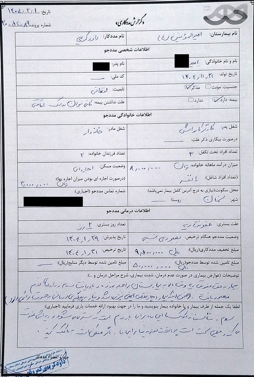 امید از اتباع افغانی بوده و تحت پوشش بیمه درمانی نمیباشد به همین دلیل هزینههای درمان وی بصورت آزاد محاسبه شده است.