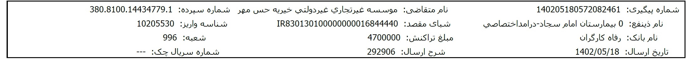 اسناد بیمارستانی و مالی پس از تکمیل مبلغ پرونده، در اختیارتان قرار میگیرد.