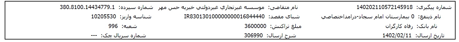 اسناد بیمارستانی و مالی پس از تکمیل مبلغ پرونده، در اختیارتان قرار میگیشرد.