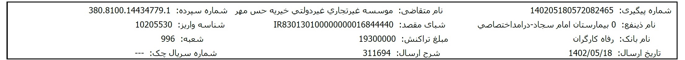 اسناد بیمارستانی و مالی پس از تکمیل مبلغ پرونده، در اختیارتان قرار میگیرد.